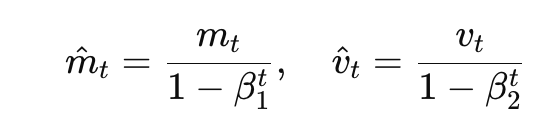 此外由于在训练初期, $$m_t$$和$$v_t$$会偏向于 0(因为一开始动量积累值太小)