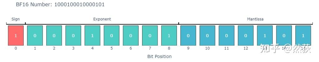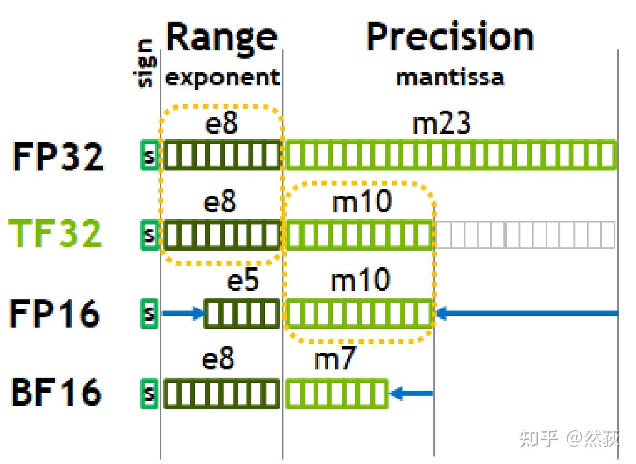 可以非常直观地看到,浮点数主要是由符号位(sign)、指数位(exponent)和小数位(mantissa)三部分组成。 符号位都是1位(0表示正,1表示负),指数位影响浮点数范围,小数位影响精度。 其中TF32并不是有32bit,只有19bit不要记错了。BF16指的是Brain Float 16,由Google Brain团队提出。