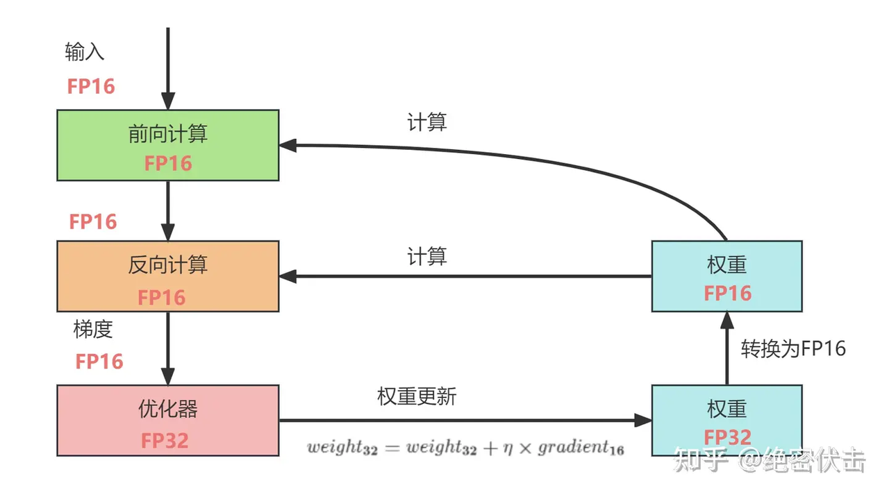 从图中可以看出,在计算过程中所产生的权重,激活值,梯度等均使用 FP16 来进行存储和计算,其中权重使用FP32额外进行备份。这样做的原因是,在更新权重公式为如下形式。
