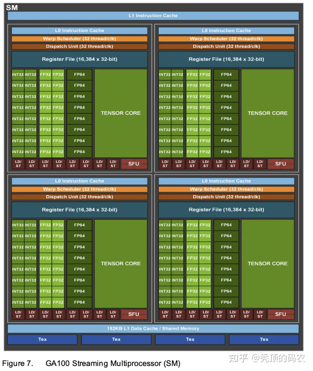 SM是核心的计算元件,下图是A100的SM的结构,可以看到: