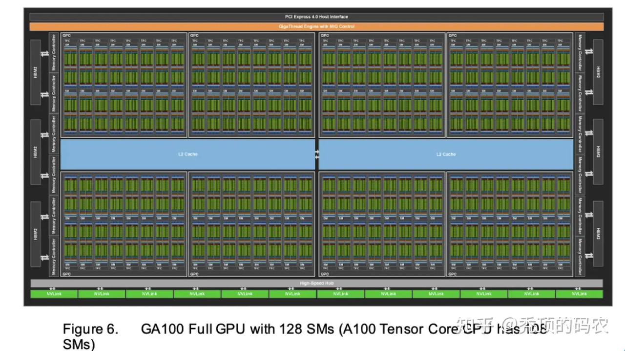 在 NVidia 的 GPU 里,最基本的处理单元是SP(Streaming Processor),A100中,64SP会组成一个SM(streaming Multiprocessor),SM是GPU中调度的基础单元,A100中总共具有108个SM,所以得到共有108*64=6192个计算核心。
