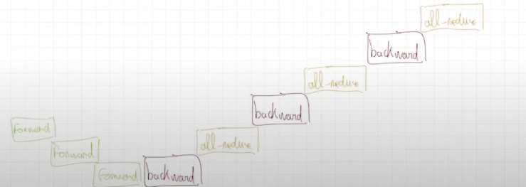 最原生的方法就是我们在前向传播后,在对每一个层进行反向传播后进行一次同步,如下图所示。由于梯度得到了及时的同步,所有优化器的状态自然也就会变得相同。