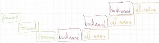 对于原生的数据并行,其最大的问题在于每层进行一次反向传播的时候都需要一个网络传输,这导致整体的速度被拖慢了。所以有提出带bucket带数据并行的方案,其特点在于将多层作为一个bucket,然后在反向传播时,只有当bucket中的所有反向传播都结束的时候才进行一次同步,同时设置该同步为异步的同步,这样就不会阻塞整体的反向传播的进程了。