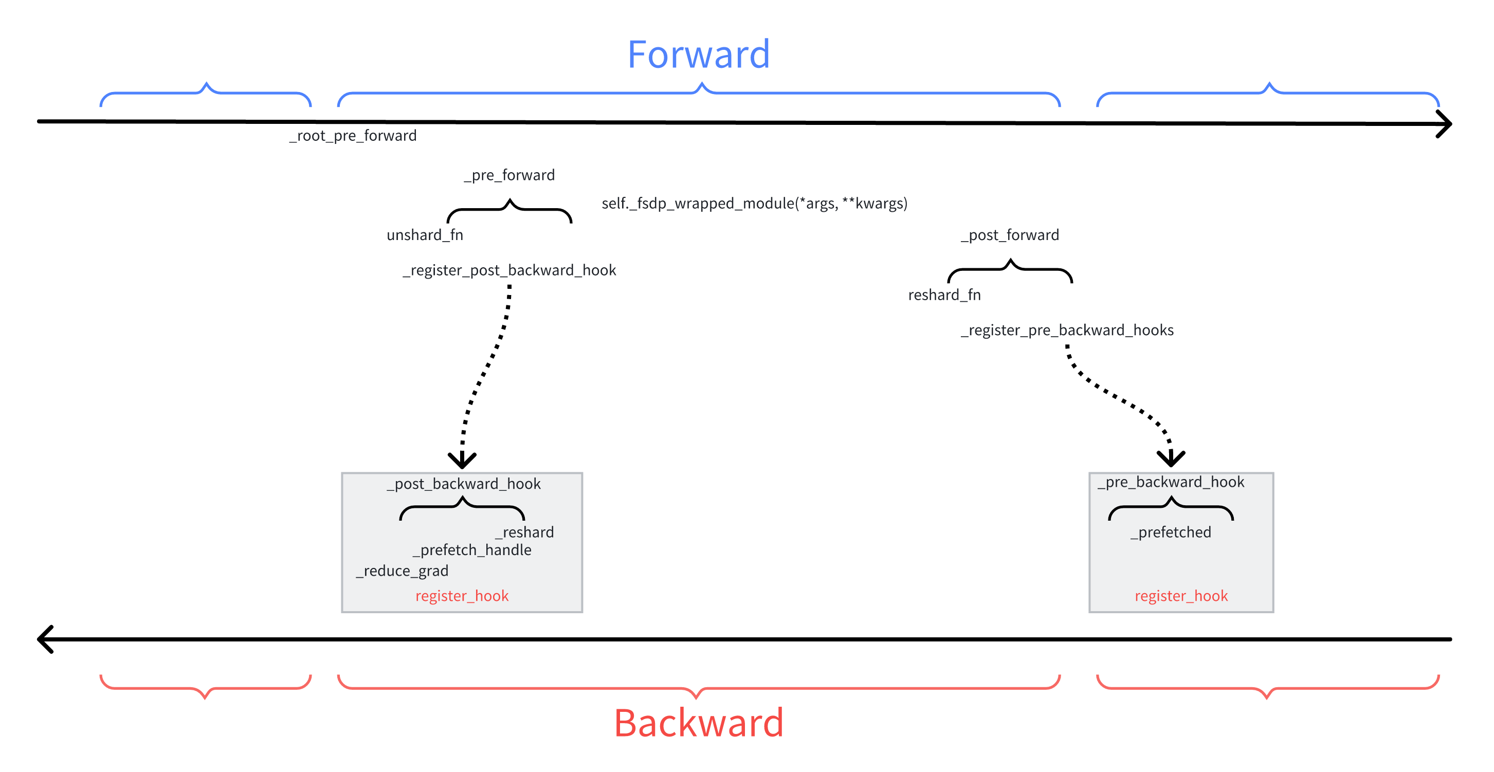 具体注册的勾子函数为_pre_backward_hook,该函数主要是执行_unshard来通过 all-gather 操作获取完整的参数,并且为了重叠计算和通信,它会立即触发下一个(在反向传播顺序中)模块参数的 prefetching(预取)。