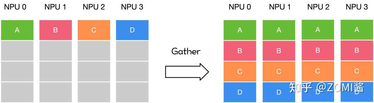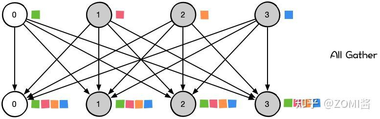 操作。这个操作的示意图如下,即将各个GPU上的分片按序收集给各个GPU上,使得每个GPU都有一个整体:
