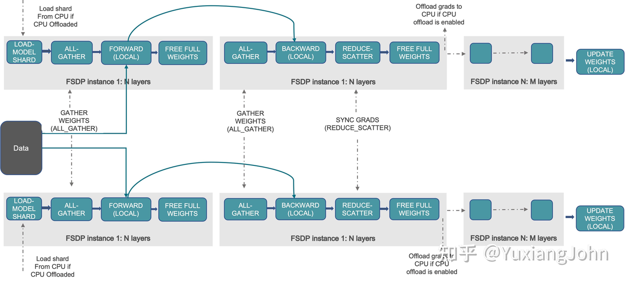 通常,模型层以嵌套方式用 FSDP 包装,因此在前向或后向计算期间,只有单个 FSDP 实例中的层需要将完整参数收集到单个设备。聚合到的完整参数会在计算后立即释放,释放的内存可以用于下一层的计算。通过这种方式,可以节省峰值 GPU 内存,因此可以扩展训练以使用更大的模型大小或更大的批量大小。为了进一步最大化内存效率,当实例在计算中不活动时,FSDP 可以将参数、梯度和优化器状态卸载到 CPU。