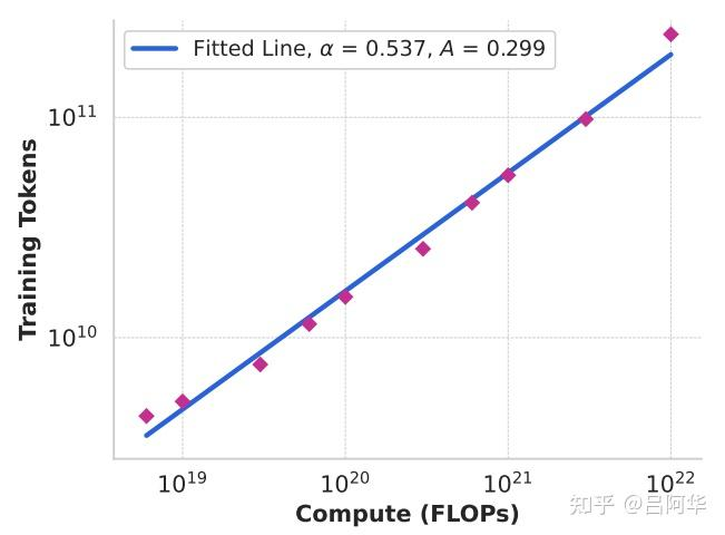- 然后对计算量C与最优Tokens数的关系N进行拟合,拟合的幂等关系为:$N(C)=AC^\alpha$,最终拟合的结果如下
