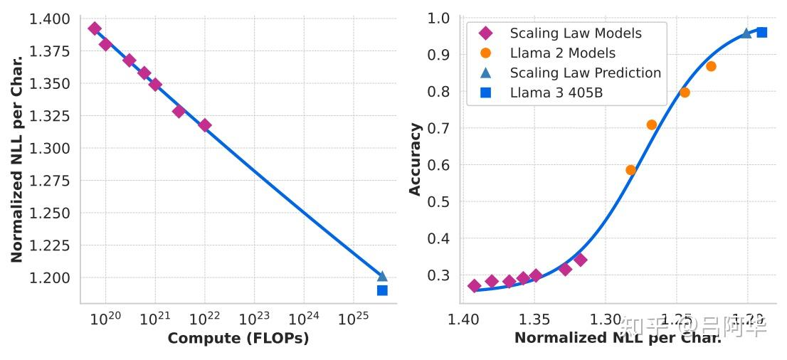 - 解决方案:利用Scaling-Laws模型和使用更高计算FLOPs训练的旧模型,建立下游任务上负对数可能性与任务准确度之间的关联性。如下图右所示,其添加了Llama 2模型。