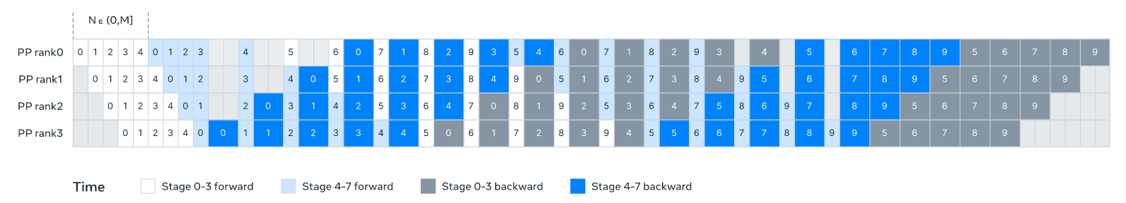 - 预训练通常需要灵活调整批次大小,但是流水线并行限制了批次大小必须是流水线阶段数量的倍数,所以其修改了流水线调度算法,如下图所示,其使用了交错流水线,层数是4,交错度是2,但是批次选取为了5。
