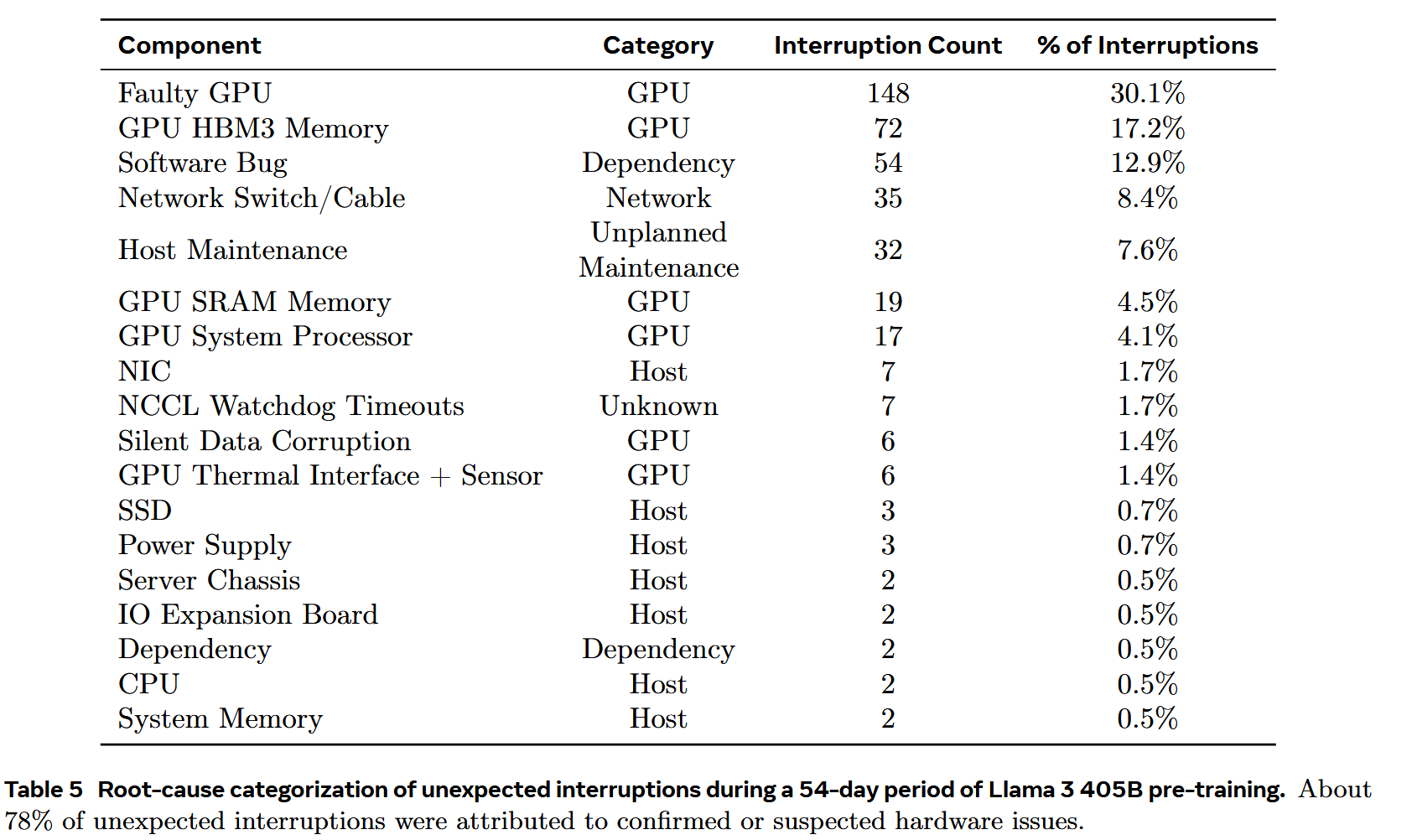 Llama 3在支持自动化集群维护,(如固件和Linux内核升级)的同时,仍实现了超过90%的有效训练时间。在预训练的54天快照期间,团队总共经历了466次作业中断。其中: