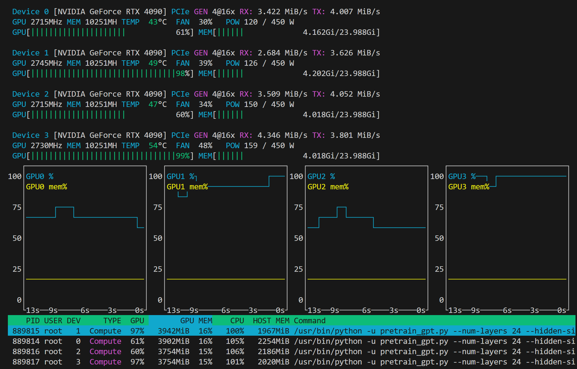 - 首先进入容器内,这次将本地全部4块GPU都挂载进去: