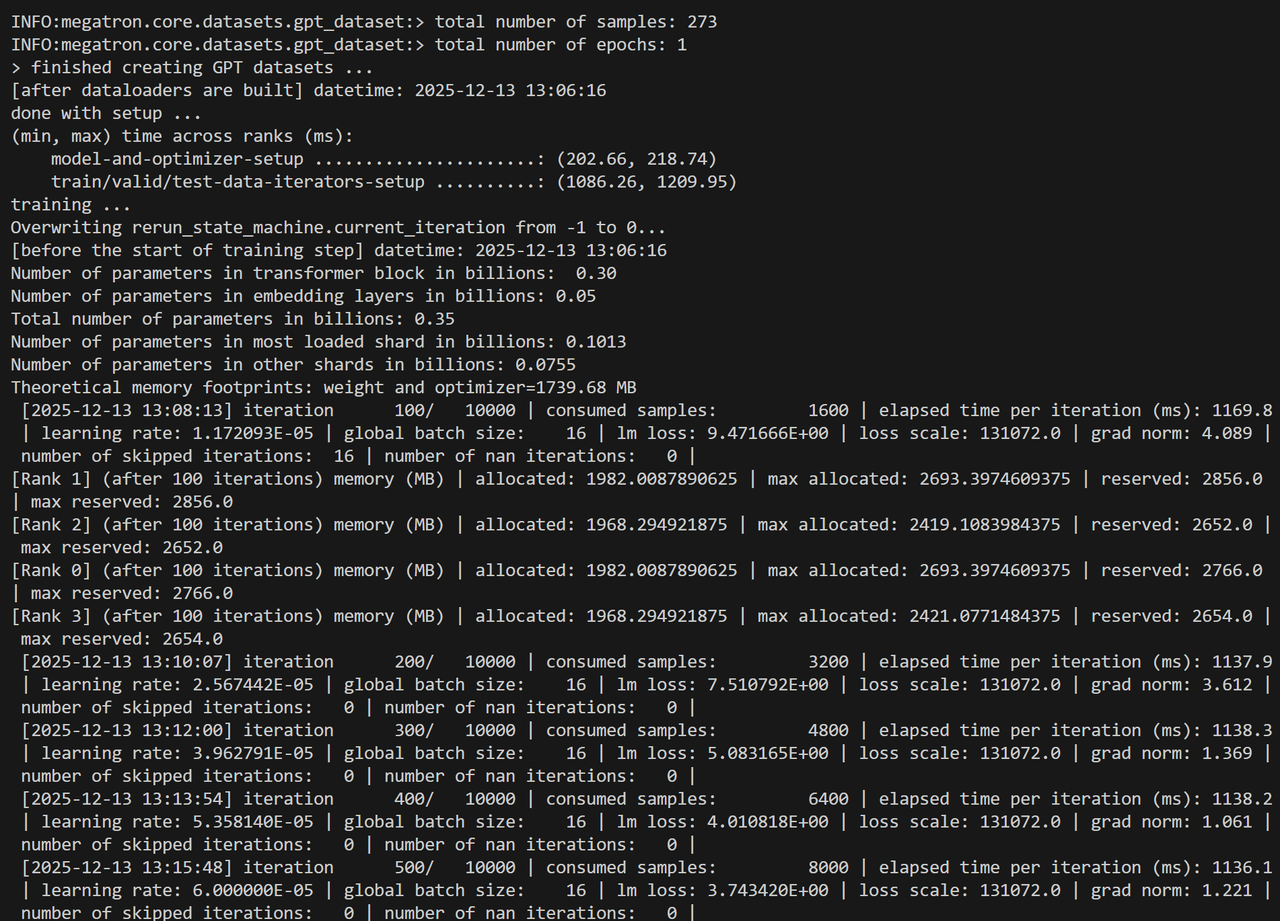 为了避免显存不足,训练步数train-iters改为10000,global-batch-size改为16,取消rampup-batch-size