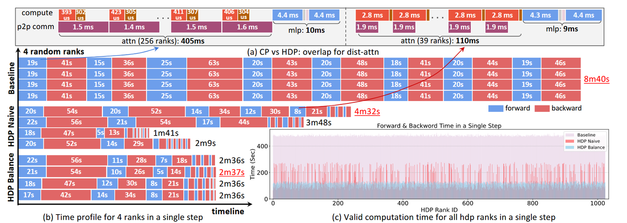 - 更灵活的通信:HDP仅要求不同的HDP rank处理相同数量的token,HDP内的worker可以直接处理一个完整的短序列,如下图(d)所示