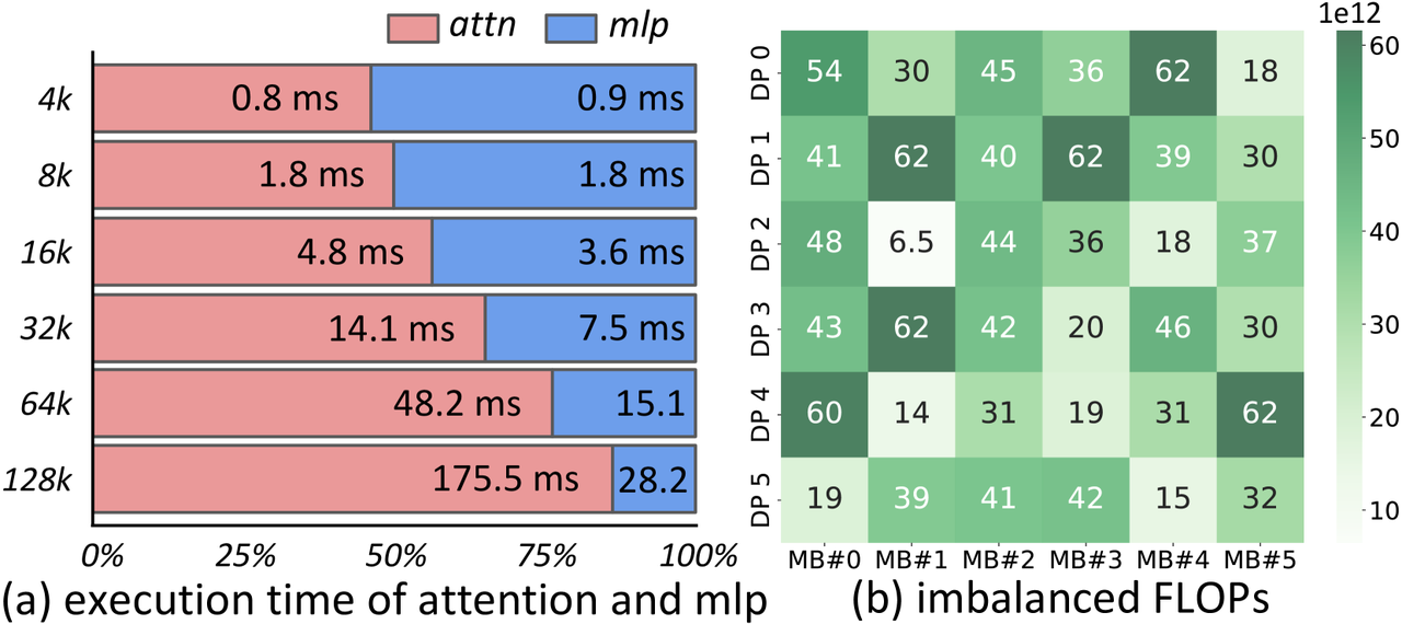 计算不平衡:尽管Token被均匀地分发给了各个worker,内存保持了平衡,但是就计算而言,其计算复杂度与原始序列的长度有关,对于都是短的原始序列,在O(S^2)的计算复杂度下,其计算时间也更短。下图显示了不同长度下的计算时间和FLOPs分布。