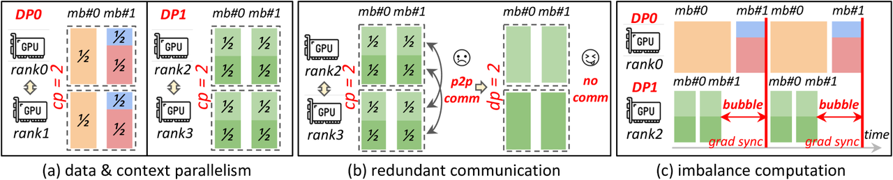 - 如下图所示,DP1内的序列本可以直接在一个GPU内直接完成,但是因为打包的原因的现在需要跨GPU直接做序列并行的冗余通信了。并且由于DP1的序列都更短,所以其计算也更快,但是在DP训练中,需要等待各个DP都计算完再进行梯度同步,这就导致了如下图(c)所示就出现了DP并行训练中的bubble。
