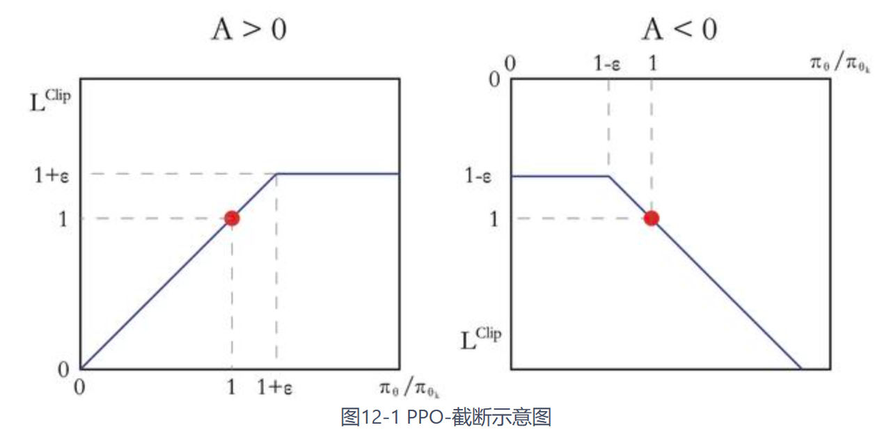 其中 $\operatorname{clip}(x,l,r)=\max(\min(x,r),l)$,将x限制在了l~r中间,然后再加上外面的min函数,对于A>0也就是好动作的情况,其将 $\frac{\pi_{\theta^{\prime}}(a|s)}{\pi_\theta(a|s)}$限制为了最大为 $1+\epsilon$,也就是好动作的概率最多只能增加到 $1+\epsilon$,对于A<0也就是坏动作的情况,其将 $\frac{\pi_{\theta^{\prime}}(a|s)}{\pi_\theta(a|s)}$限制为了最小为 $1-\epsilon$,也就是坏动作的概率最多只能减少到 $1-\epsilon$,如下所示。其效果就是不让概率剧烈的变化