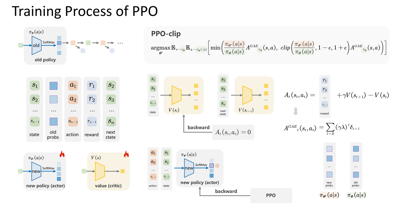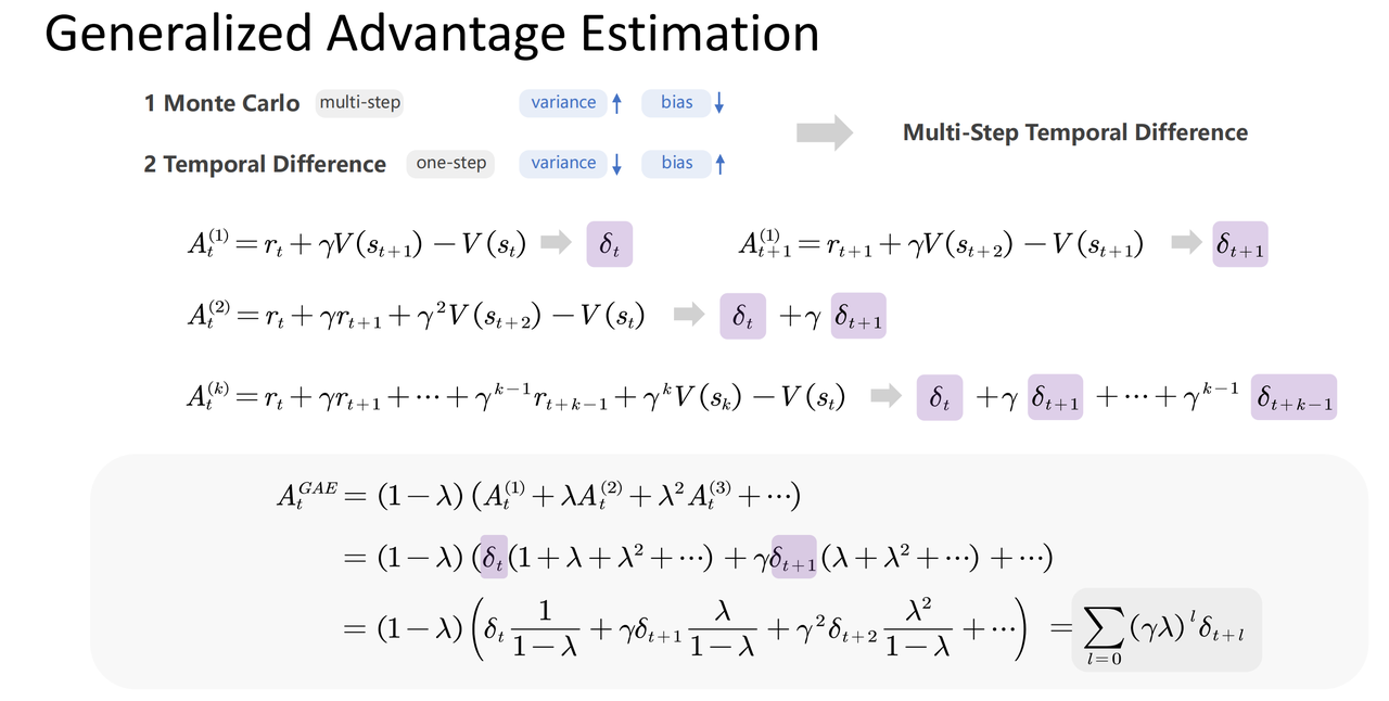- 此外在实际训练PPO时往往采用的是 $A_t^{GAE}$,其与多步SARSA的思想类似,推导公式如下