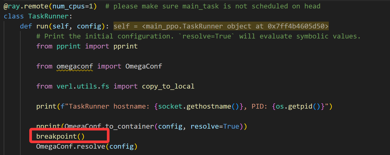 然后需要在需要debug的ray任务的代码中加入breakpoint()关键字