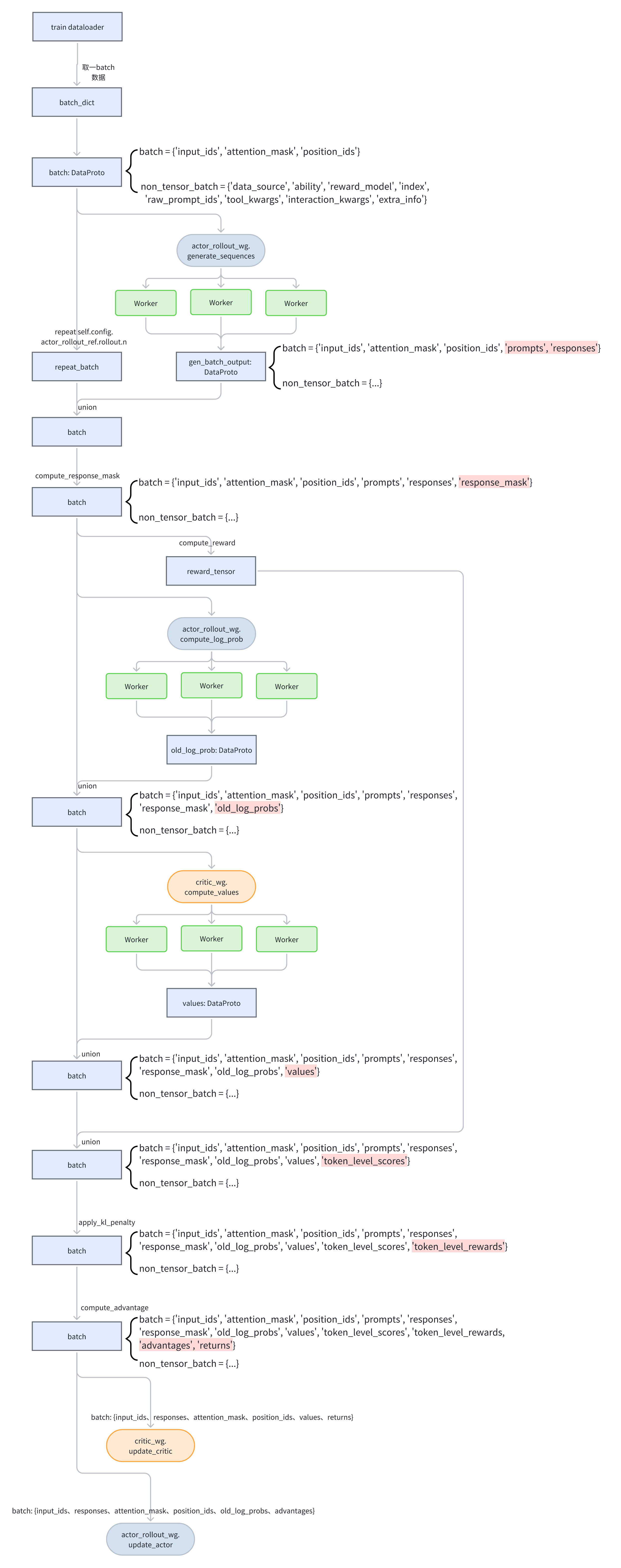 input_ids、responses、attention_mask、position_ids来在actor中重新前向传播得到最新模型的log_prob,用于结合old_log_probs对advantages进行重要性采样然后使用经典的PPO clip来计算重要性采样下的advantage,从而更新actor