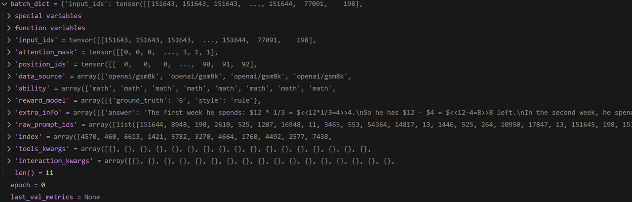 batch: DataProto = DataProto.from_single_dict(batch_dict)- 其获取到的batch_dict数据如下,可以看到其既包含原始数据,也包含了tokenizer处理后的数据,以及相关的attention_mask和position_ids等