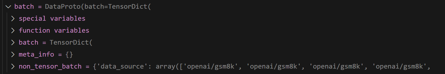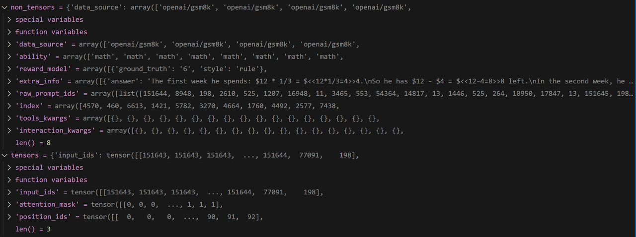 DataProto类的batch,DataProto是Verl核心的数据处理类,其负责将tensor类型的变量转化为TensorDict,从而方便做到batch级的操作,如读取第几个batch的数据,或者将其切分为好几个小batch,还负责将非tensor内容放置到non_tensor_batch中。- 如下所示,tensor类型的变量包括了训练的核心数据