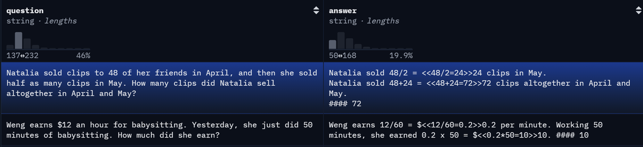 这里以经典的gsm8k数据集(https://huggingface.co/datasets/openai/gsm8k)为例,介绍Verl对其一开始做了什么处理。