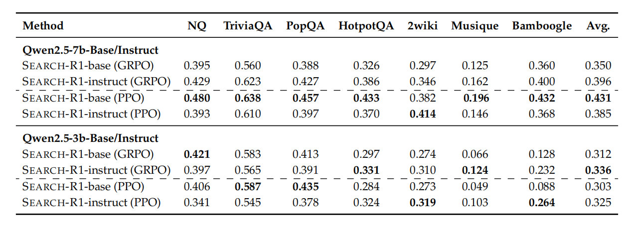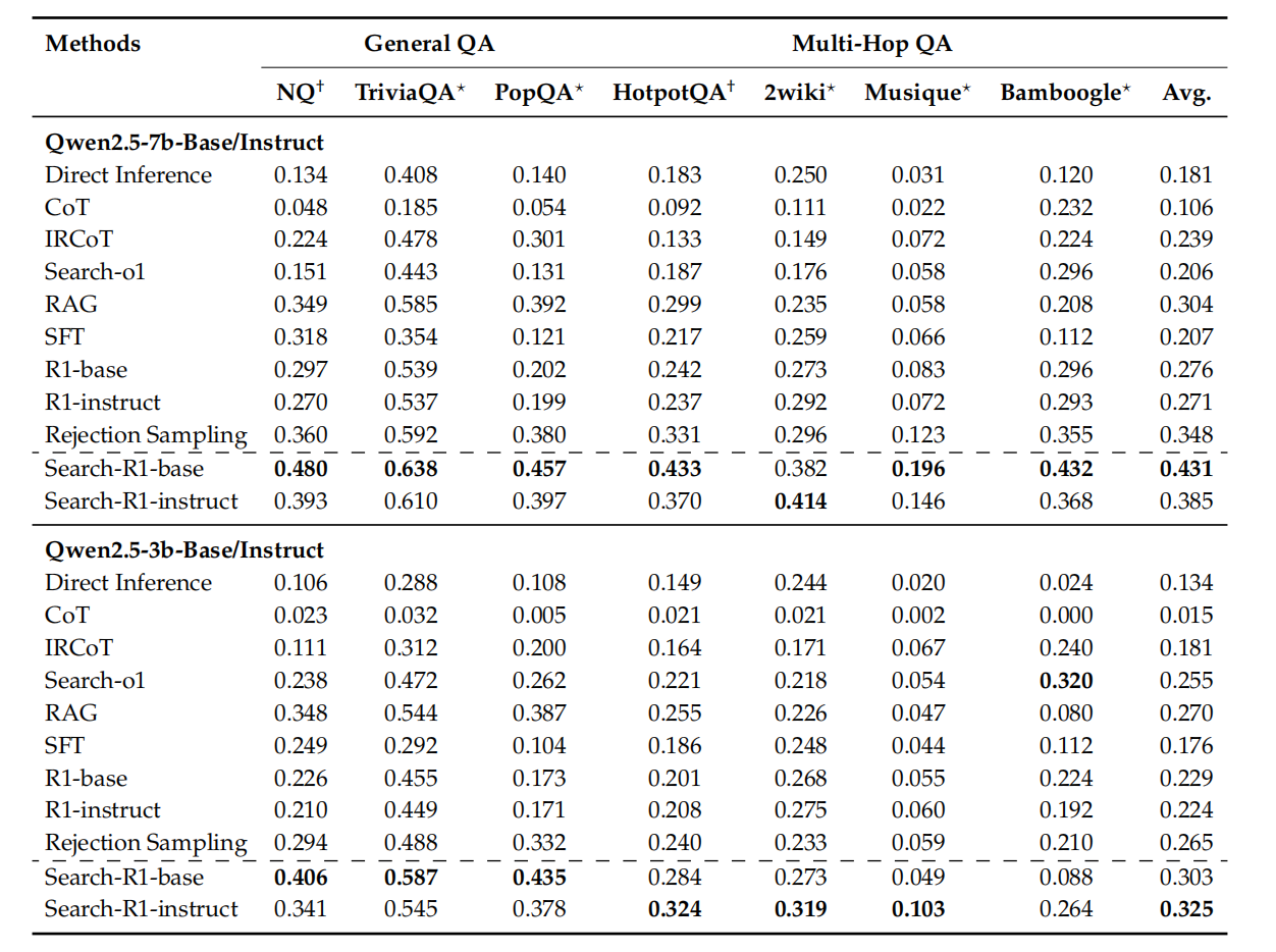 整体结果很强,Search-R1 在大多数设置下都优于基线。