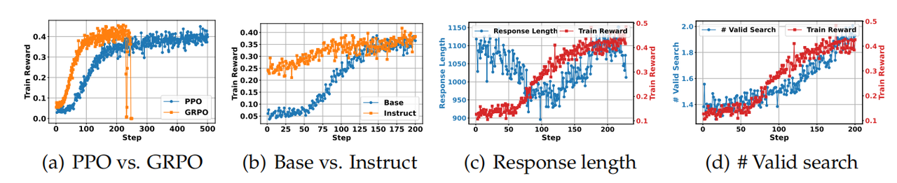 个人认为主要贡献是跑通了使用强化学习来进行search调用增强的一整个流程,整体的设计并没有说很惊艳的部分,但是有些细节确实是值得注意的,并且也确实是跑出来效果了,RL有时真是力大砖飞。