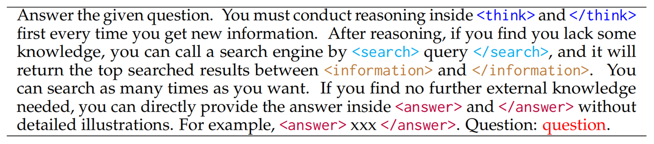 把搜索引擎当作工具,让模型边想边查。目前这类方法主要依赖prompt注入或者通过sft来增强。其问题在于模型通常并没有在训练中真正学会“如何搜索”。