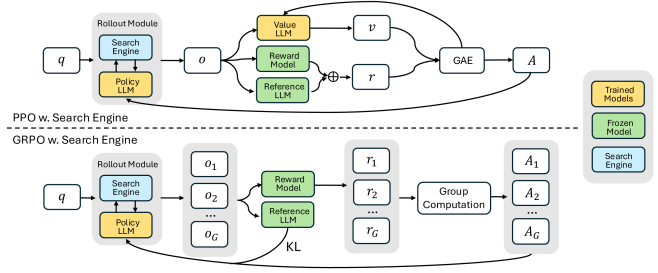 下图对其PPO训练和GRPO训练两类流程进行了说明: