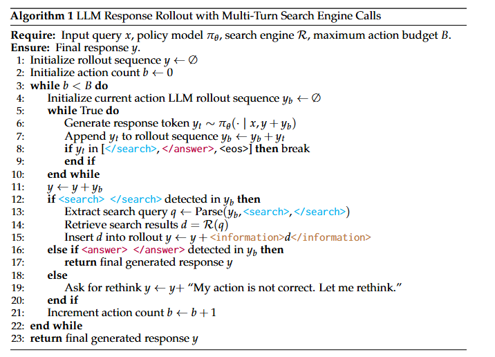 文把搜索引擎视为环境的一部分,在 rollout 时允许模型进行多轮交互。模型每次先生成一段当前 action,如果匹配发现生成了 </search>,就解析出查询词并执行检索,然后将检索的内容追加到结果中,继续推理,如有需要还可以继续search。